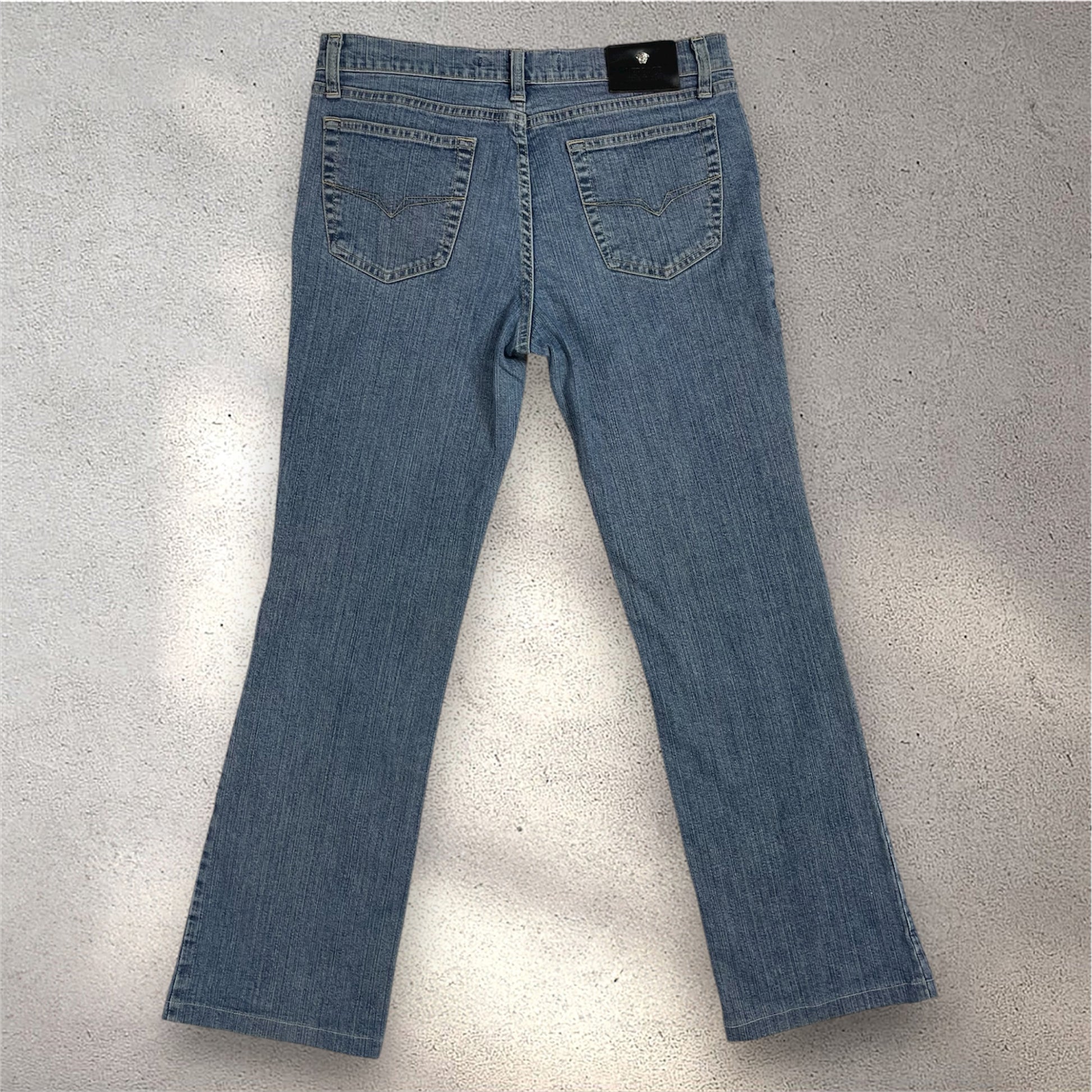 Versace Jeans Couture (ITTIERE) light-wash denim jeans with Medusa button, branded rivets, and black leather back patch. Made in Italy. Labelled W30 however measures slightly W29.5 due to age, best for a UK 8-10.