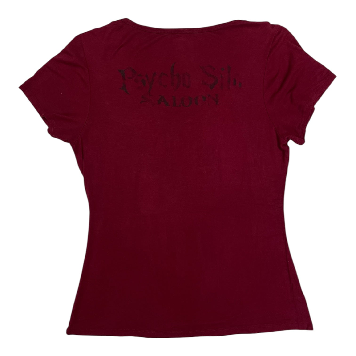 Vintage Y2K Liberty Wear tee in deep wine red with an ornate cross motif detailed in rhinestones and flocked black print. Features gothic “Psycho Silo Saloon” text on the back and soft stretch rayon-blend fabric for a fitted silhouette.