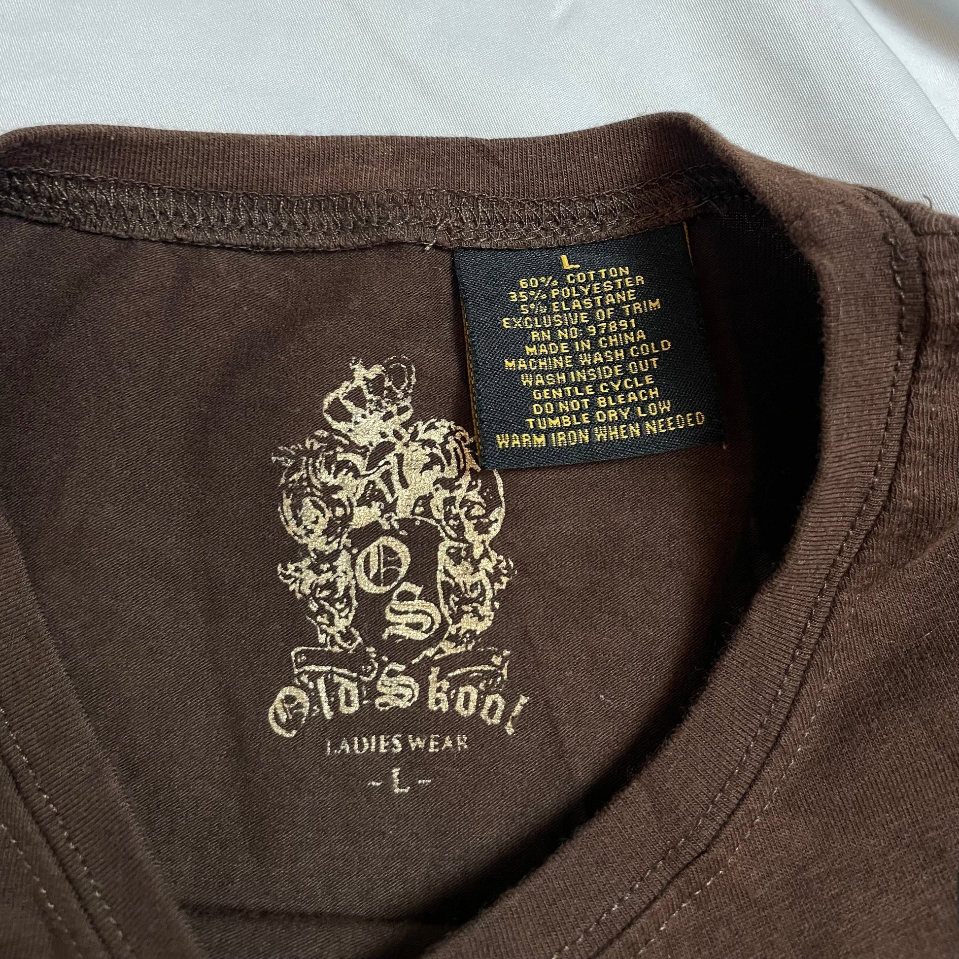 Early-2000s Old Skool Ladies Wear tee in deep chocolate brown with metallic gold “Old Skool” text and ornate winged cross print across the front and back.