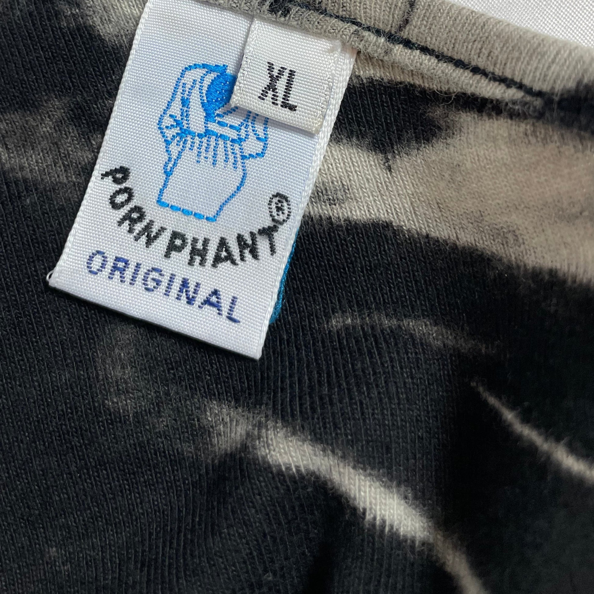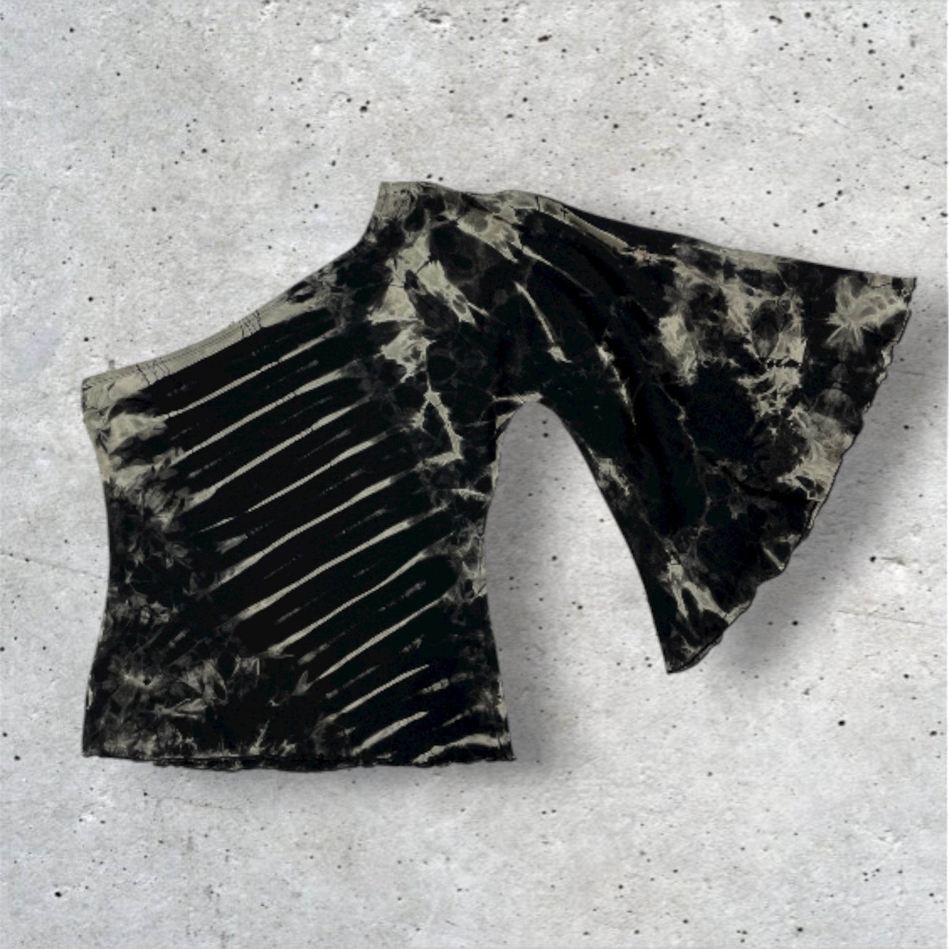 Rare Y2K-era top from cult brand PornPhant. Features an asymmetrical one-shoulder cut, dramatic bell sleeve, and bold black/grey tie-dye pattern. Fitted stretch that flatters the shape.