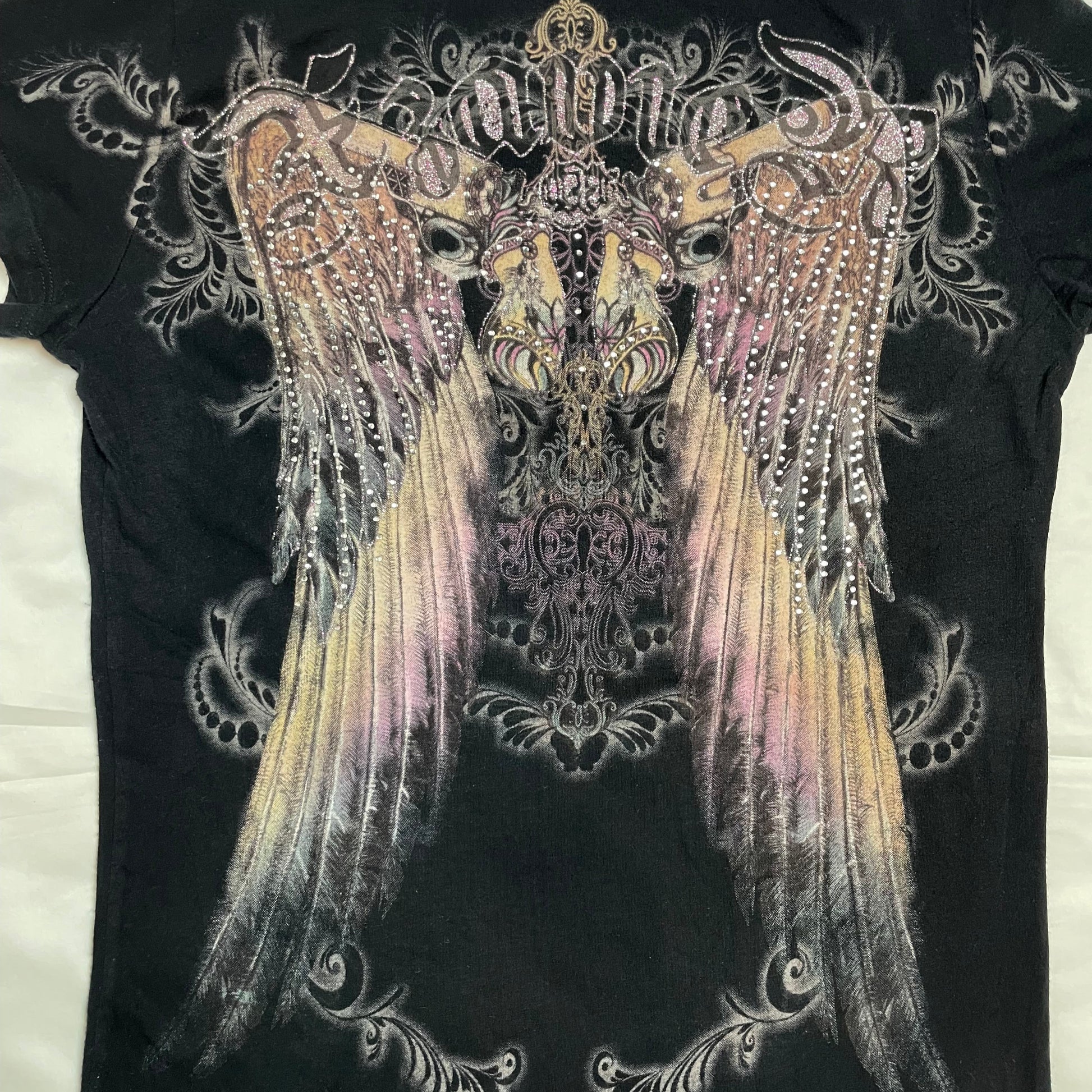 Y2K Xzavier USA embellished tee featuring a mirrored wing graphic across front and back, finished with rhinestone and metallic fade detailing.